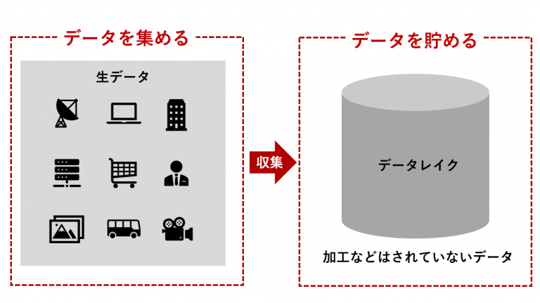収集してきたデータはデータレイクに蓄積していきます。この段階のデータは、まだ加工などを施されていない生の状態です。