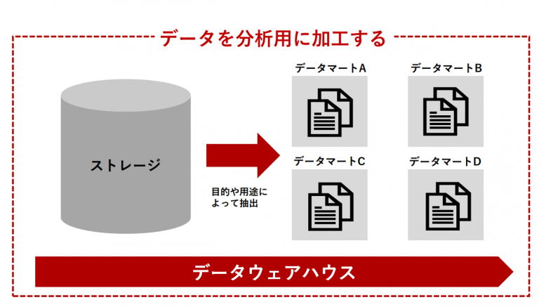 データウェアハウスに保管された加工データを、売上分析や顧客行動の分析といった具体的な目的や用途に沿って抽出し、保管する場がデータマートです。
