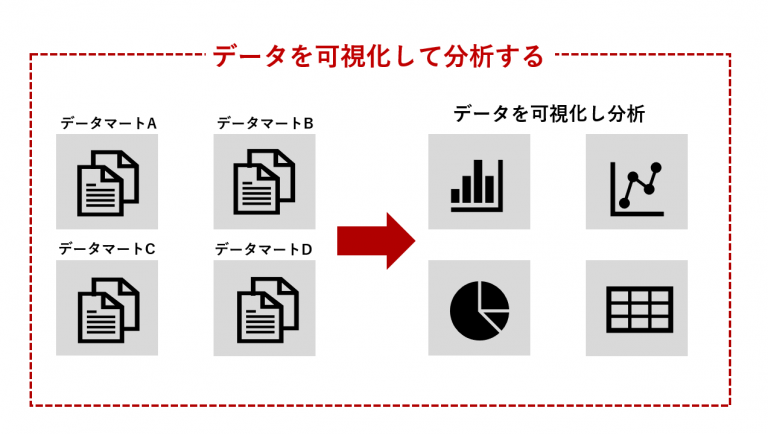 データマートに保管された加工データとはいえ、私たちが意思決定する材料としては利用しづらいため、最後に可視化して分析する工程が必要です。たとえばチャートやグラフによる可視化が代表的な方法でしょう。